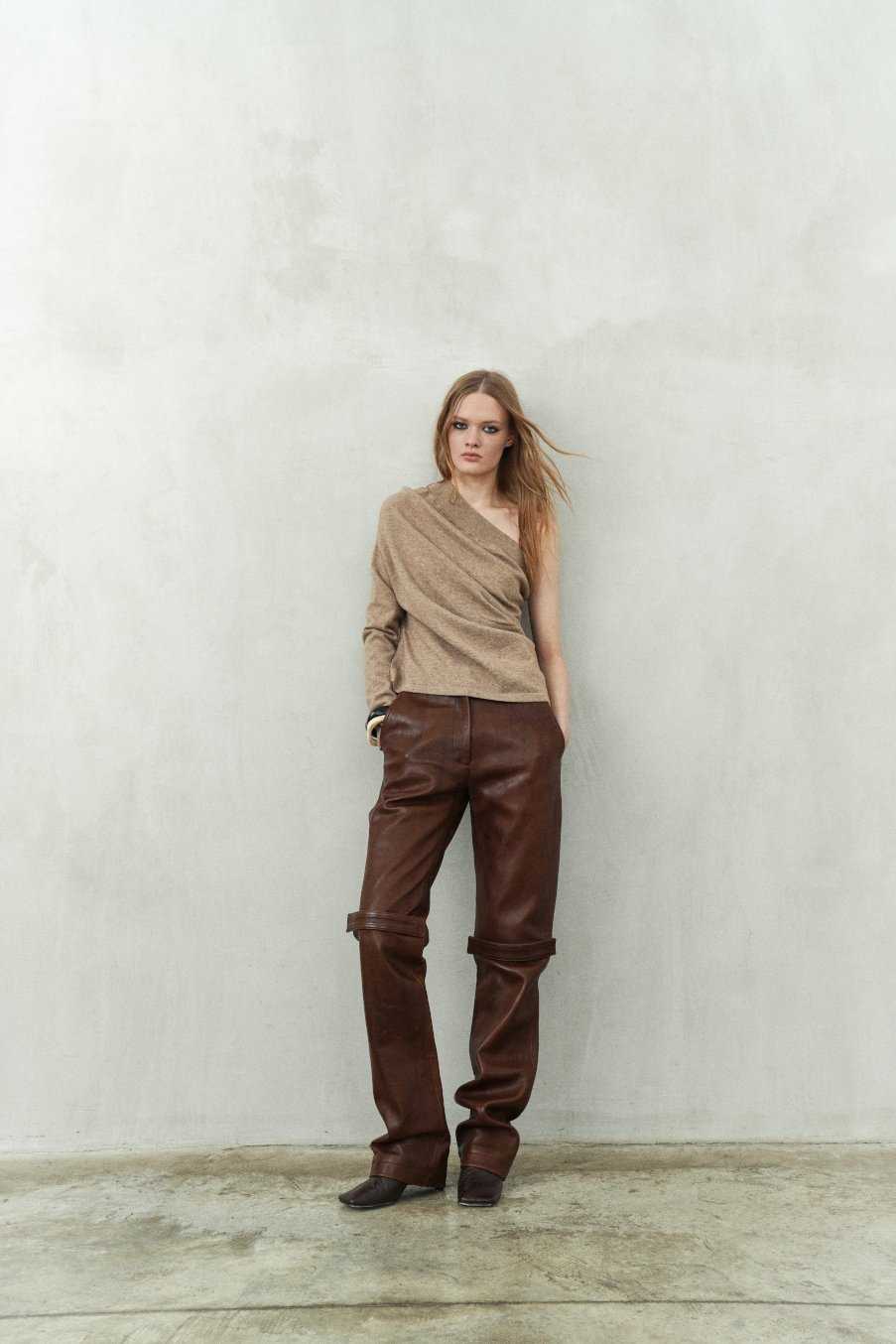 Прямые брюки из плотной кожи, свободного кроя. Изделие изготовлено из натуральной кожи с фактурной поверхностью. Подойдут на высокий рост.