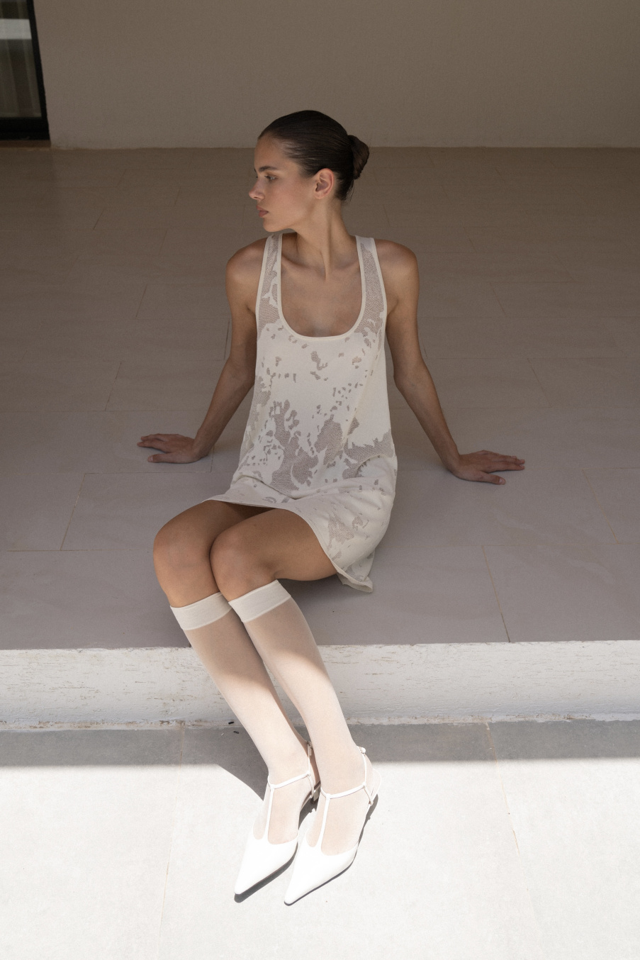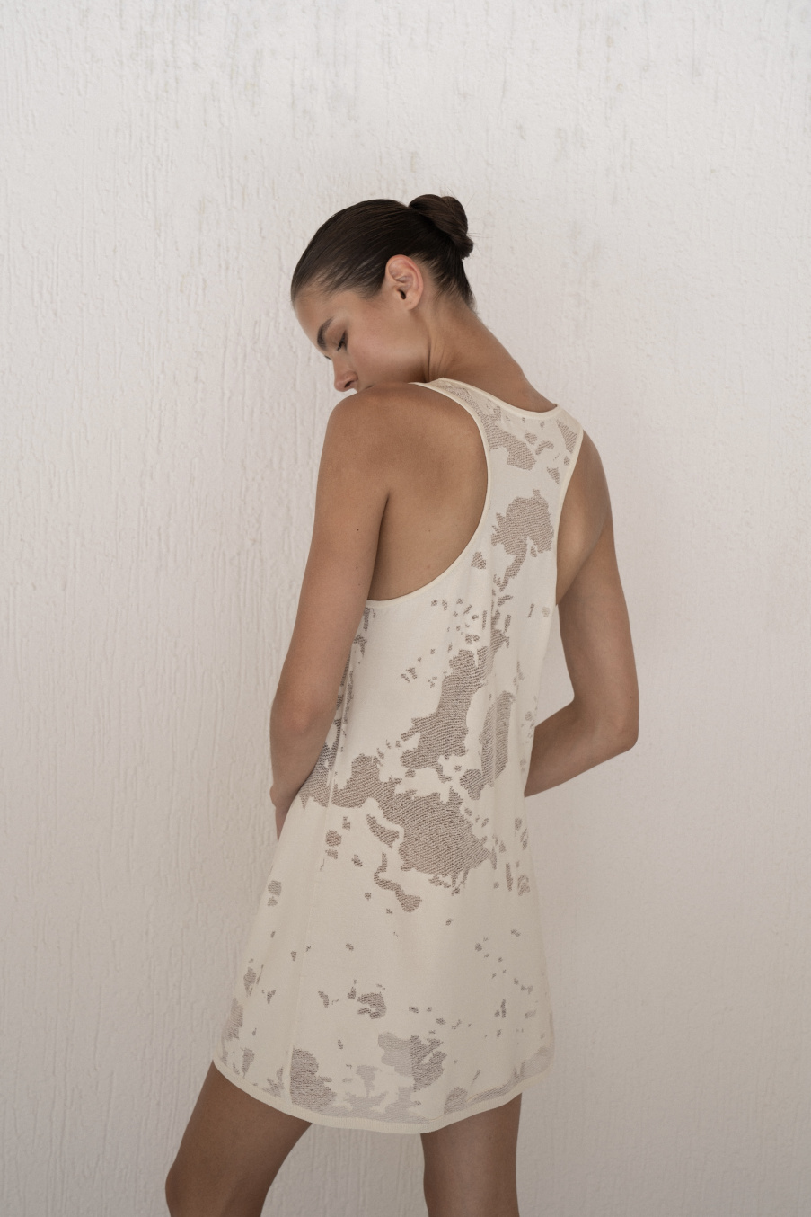 Платье из итальянской премиальной вискозы изготовлено с использованием новейшей технологии double layers, тончайшая вискозная нить поверх нейлоновой основы создает эффект деконструированных частиц.