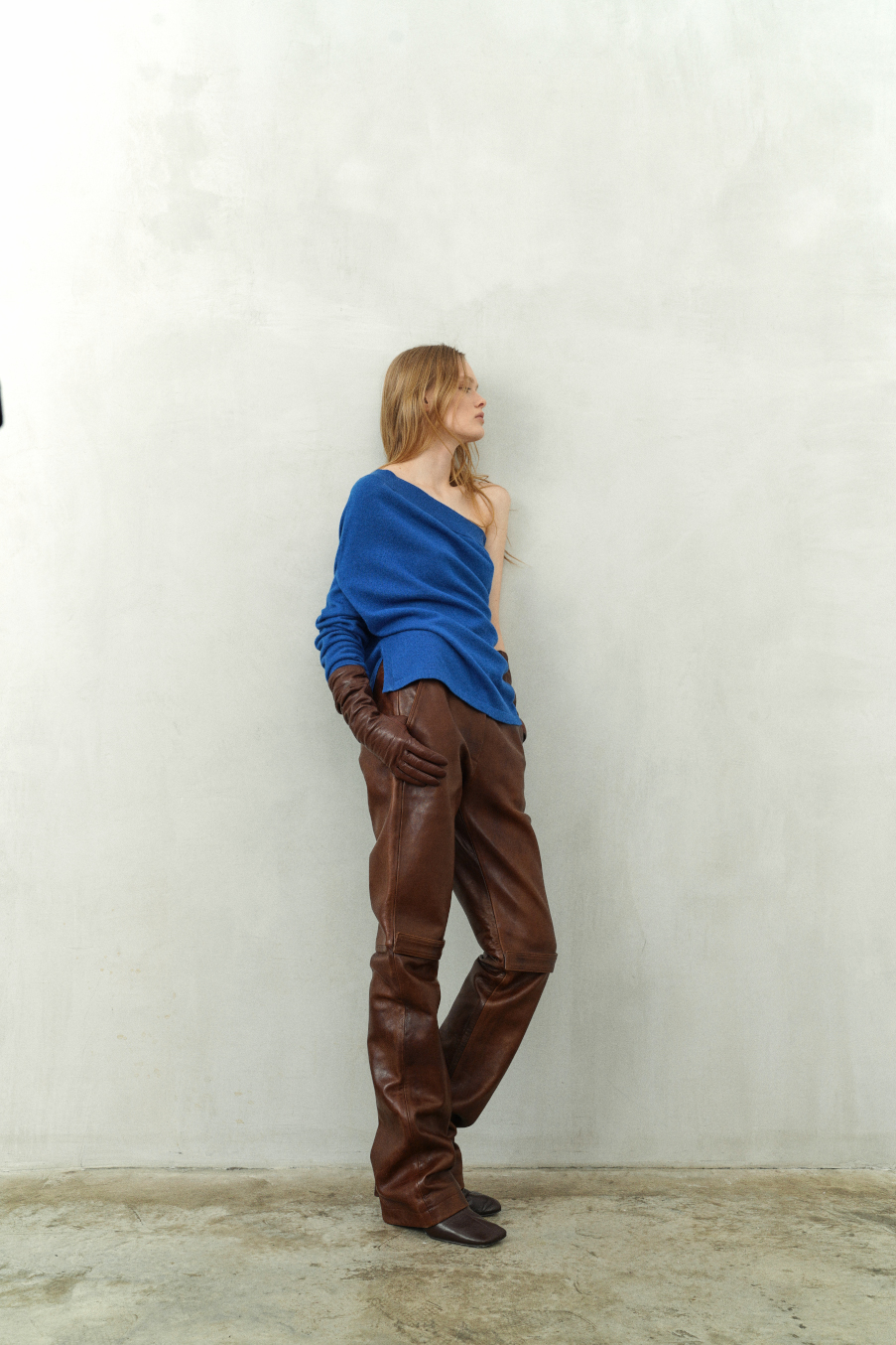 Джемпер на одно плечо с защипами на талии, подчеркивает фигуру. Сборка на талии добавляет объем и текстуру, делая силуэт еще более привлекательным.