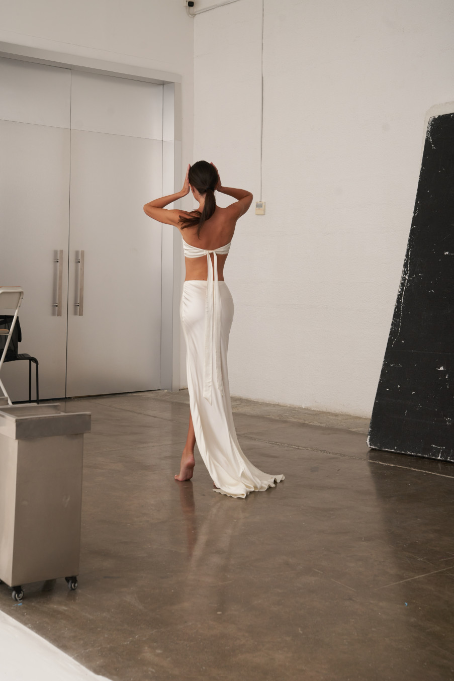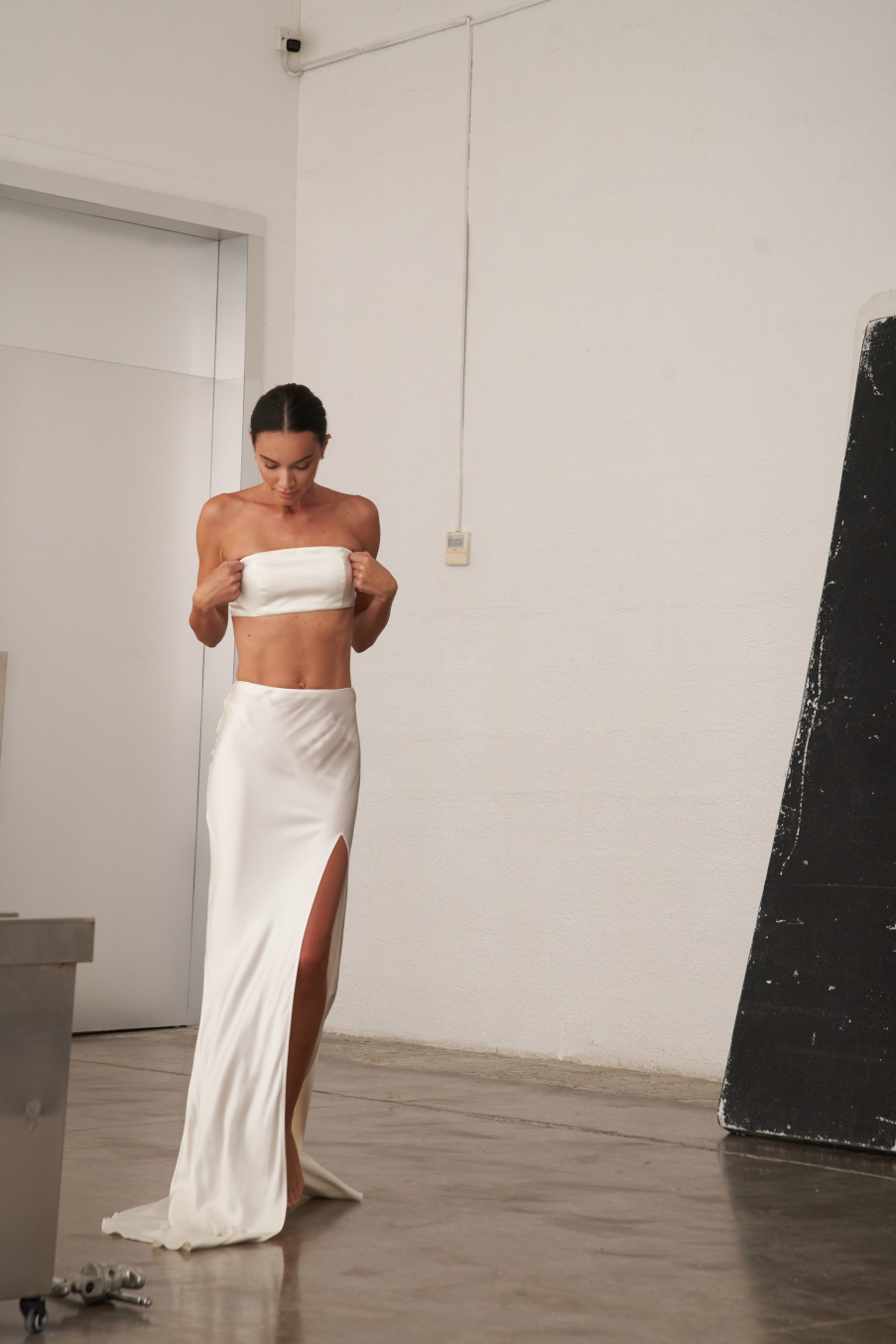 Костюм Midnight, топ-бандо из итальянской вискозы и шелка, без бретелей, завязывается сзади на длинные завязки-ленты и юбка макси. Благодаря высокой талии, высокому разрезу на бедре и крою, юбка визуально моделируют и удлиняет фигуру. Изготовленный из скрепленного вискозного атласа с шелком, костюм обеспечивает комфорт и простоту движений.  Идеальная базовая вещь для вашего гардероба, которая  подходит для дневных и вечерних мероприятий.