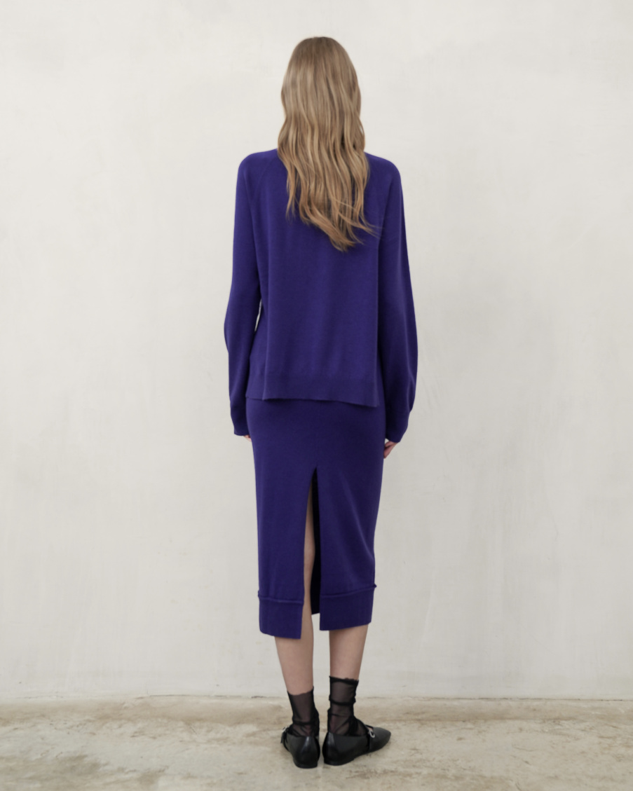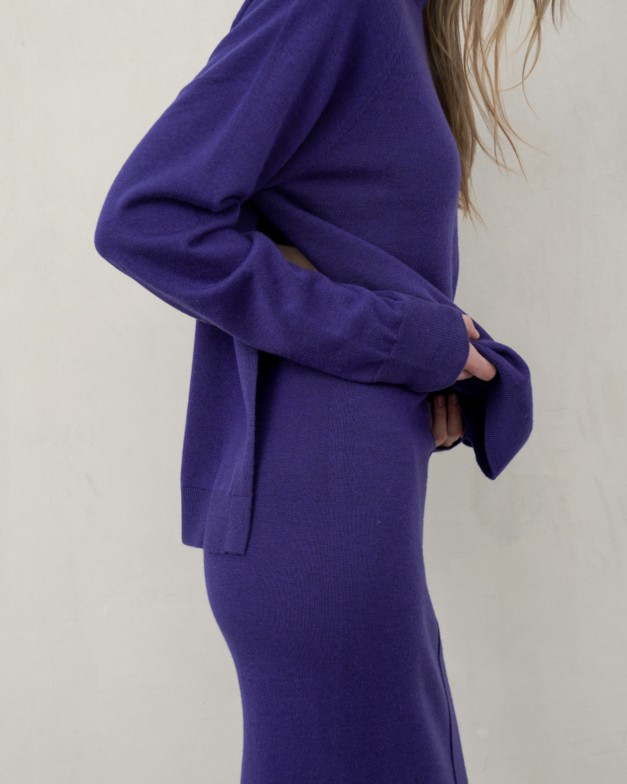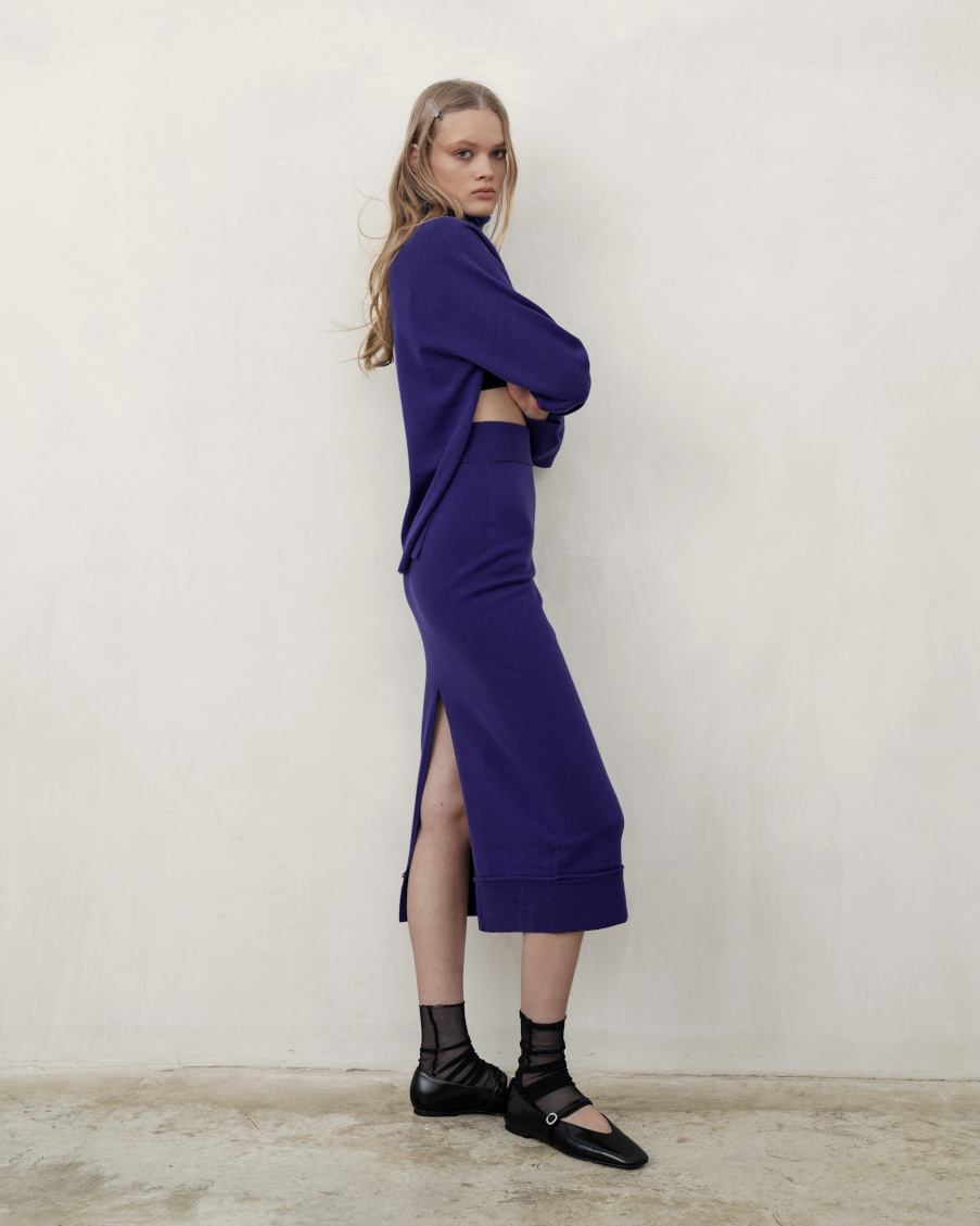 Костюм, состоящий из джемпера с боковыми разрезами и юбки длины миди, изготовлен из итальянской пряжи, легкий и мягкий. Джемпер имеет боковые разрезы,  визуально удлиняющие силуэт, а юбка с высокой шлицей добавляет образу современный акцент.