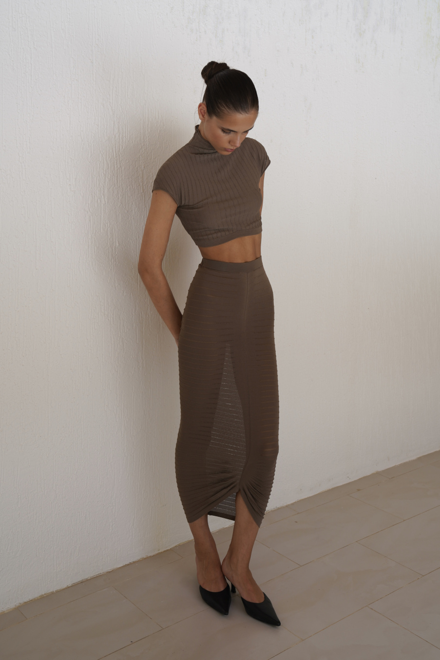 Костюм, состоящий из укороченного топа с цельной горловиной-стойкой, и юбки в длине миди с вертикальным рельефным швом и декоративными поперечными рельефами, юбка создает облегающий силуэт и подчеркивает изгибы фигуры. Костюм из итальянской премиальной вискозы изготовлен с использованием новейшей технологии модального плетения.