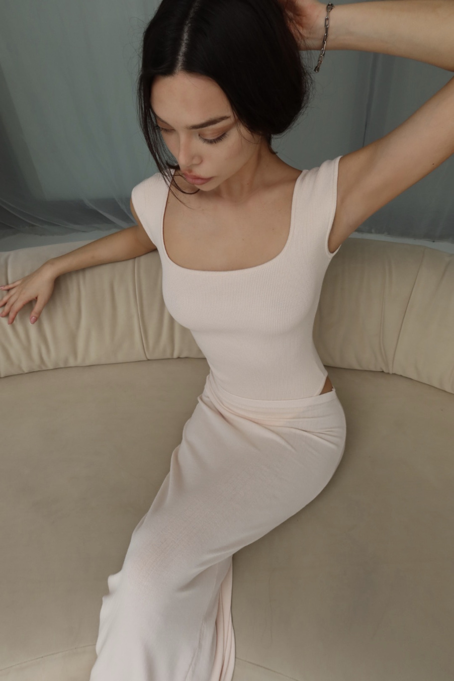 Костюм состоит из боди на фигурных бретелях, и юбки в длине макси, юбка создает облегающий силуэт и подчеркивает изгибы фигуры.
