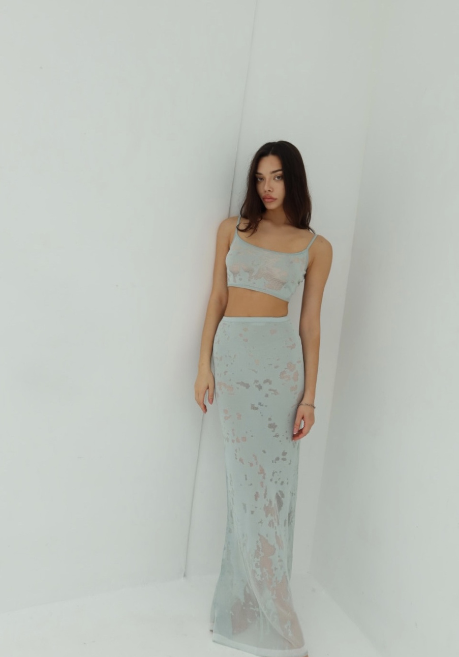 Костюм, состоящий из топа на тонких деликатных бретелях, и юбки в длине макси из струящейся вискозы, юбка создает облегающий силуэт и подчеркивает изгибы фигуры. Костюм из итальянской премиальной вискозы изготовлен с использованием новейшей технологии double layers, тончайшая вискозная нить поверх нейлоновой основы создает эффект деконструированных частиц.