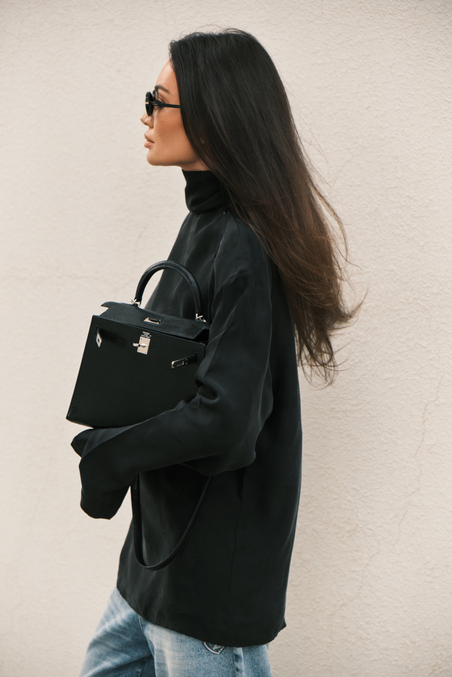 Блуза из чёрного шёлкового купро с декоративным узлом. Струящийся, свободный крой, рукава, суженные к запястью. Эффект струящейся ткани усиливается блестящей отделкой. Высокий воротник завязывается сзади на завязку.