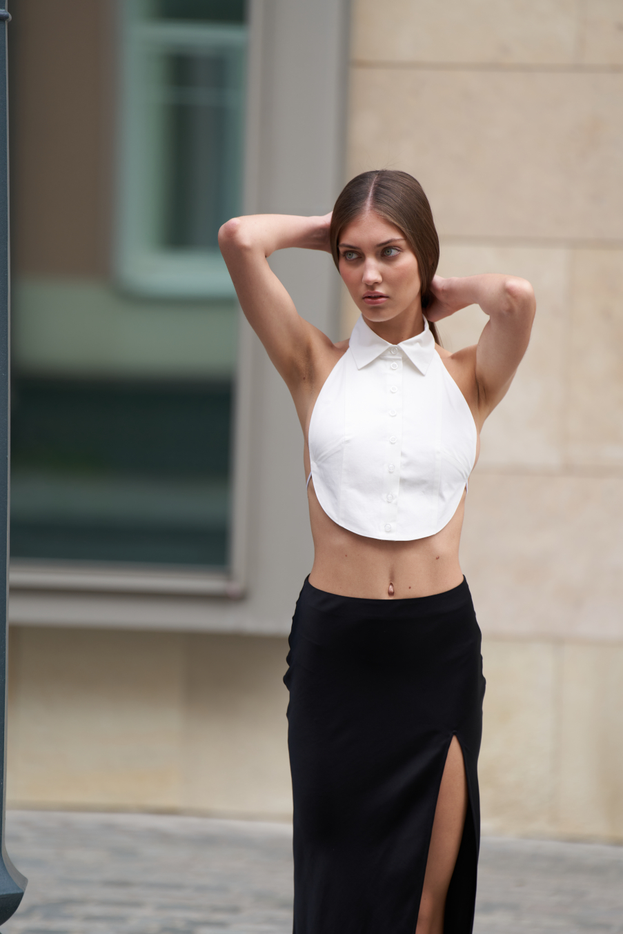 Рубашка-смокинг Harper с открытой спиной, застежка на пуговицы спереди, с заостренным воротником-халтер, без рукавов, тонкая бретелька сзади. Идеально сочетается с леггинсами и юбкой макси из капсулы Kristina Ozimkova.