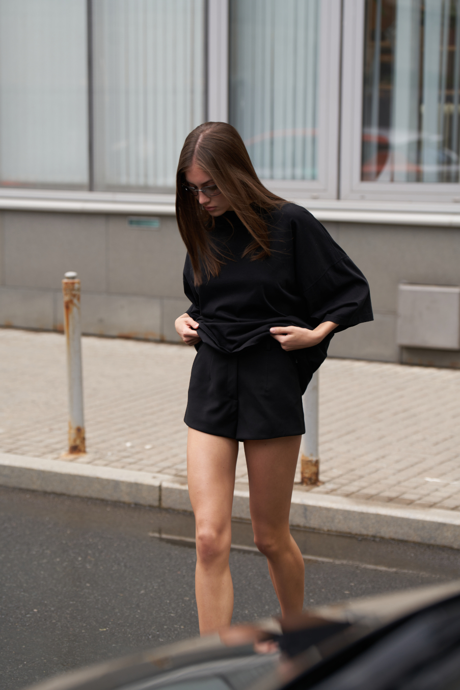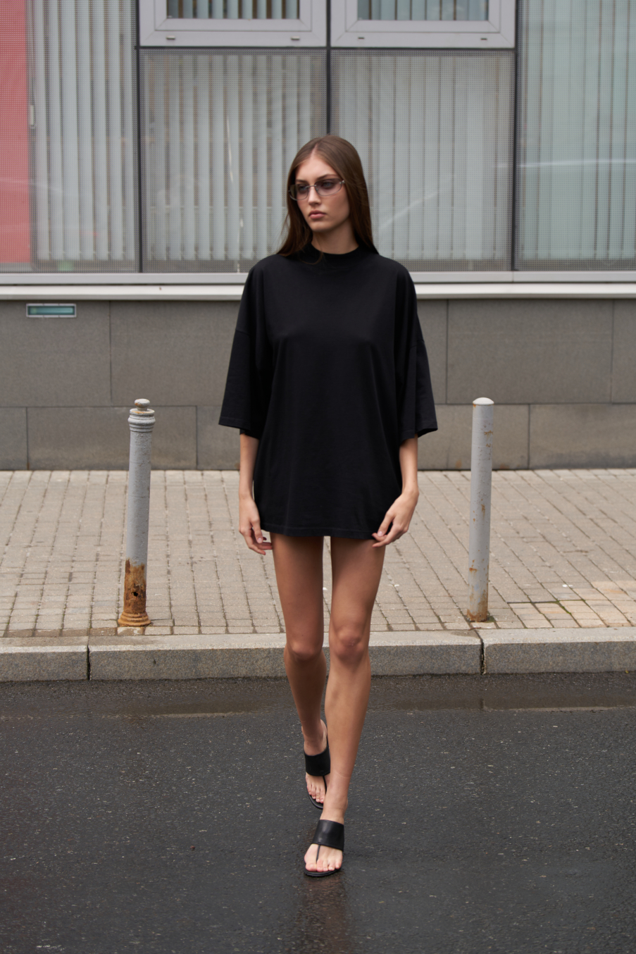 Футболка свободного кроя в черном цвете. Для модели был выбран дышащий и плотный хлопок, который позволяет изделию держать форму и быть приятным для тела.