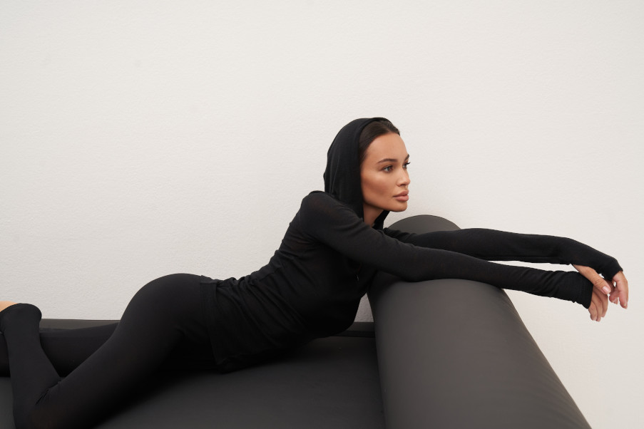 Лонгслив с капюшоном на молнии, облегающий как вторая кожа, выполнен из итальянской эластичной вискозы в классическом черном оттенке. Изделие одинаково хорошо смотрится как в многослойном варианте, так и в одиночку. Рукава с отверстиями для больших пальцев обеспечивают дополнительный комфорт и стиль.